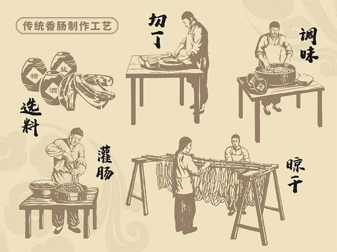 北魏·賈思勰《齊民要術(shù)》—灌腸法:“取羊盤腸,凈洗治。細(xì)銼羊肉,令如籠肉,細(xì)切蔥白、鹽、豉汁、姜、椒末調(diào)和,令咸淡適口,以灌腸。兩條夾而炙之。割食甚香美?!边@是有據(jù)可查的最早關(guān)于香腸工藝的史料記載。