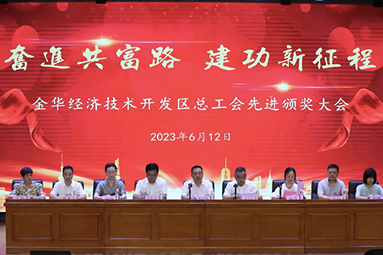 日前,6月12日下午,金華開發(fā)區(qū)總工會(huì)在李漁小學(xué)報(bào)告廳召開“奮進(jìn)共富路,建功新征程”先進(jìn)頒獎(jiǎng)大會(huì)。經(jīng)申報(bào)、推薦、審查、評(píng)審和公示等環(huán)節(jié),我單位陳順通、姜濤二位員工榜上有名。生產(chǎn)副總監(jiān)陳順通被授予2023年度“八婺金匠”榮譽(yù)稱號(hào),生產(chǎn)副總監(jiān)姜濤被授予2023年“金開工匠” 榮譽(yù)稱號(hào)。
